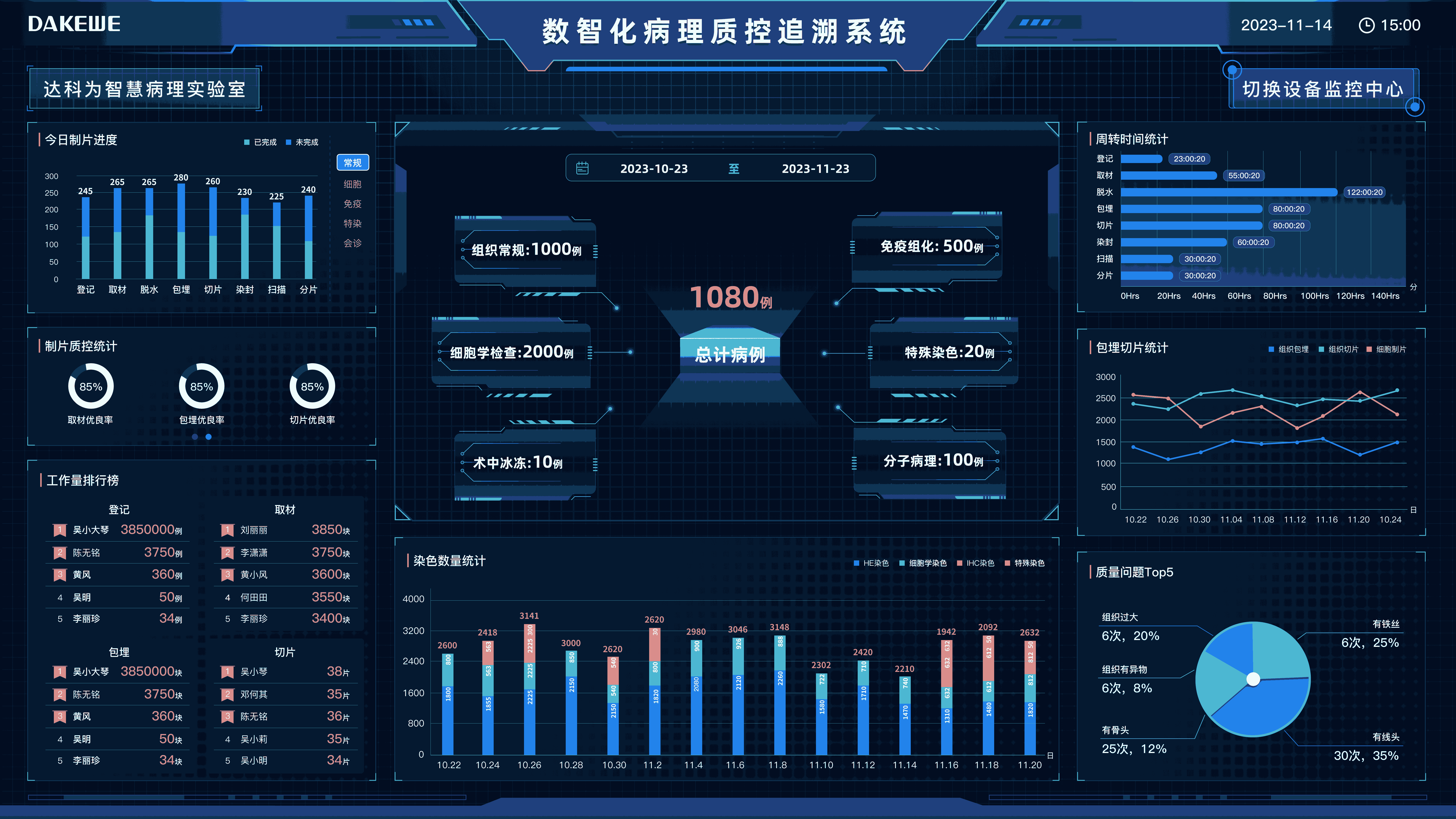 病理标本追溯系统通过智能管理系统,记录取材、脱水、包埋、切片、染色等技术环节的信息。系统实时监控标本状态、位置,并对标本进行质量评价和处理结果,提供进度提示和语音播报,帮助技术人员减少错误、提高效率,实现病理技术智控的全面管理。