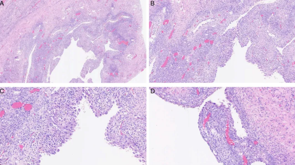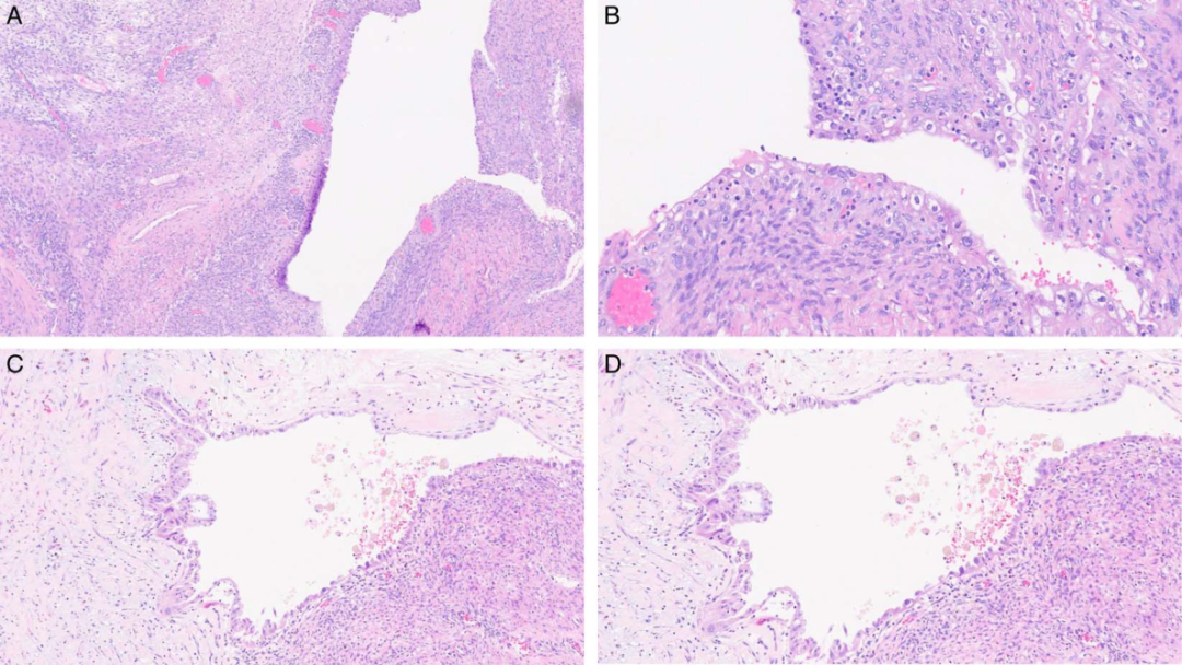 大体表现方面,所有病例的卵巢囊肿内容物均为出血性;有大小信息的病例中,从47mm到140mm不等。组织学上,所有病例均可见卵巢子宫内膜异位囊肿,局灶衬覆子宫内膜样上皮、下方可见子宫内膜样间质和吞噬色素的巨噬细胞。部分区域的衬覆上皮缺失,由含铁血黄素及机化纤维组织衬覆。