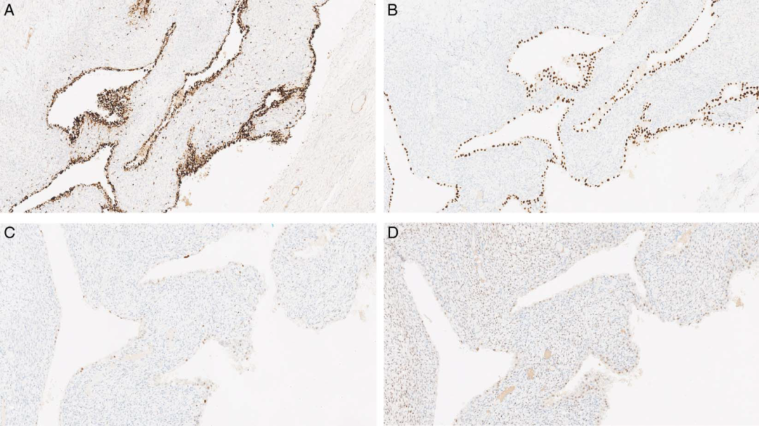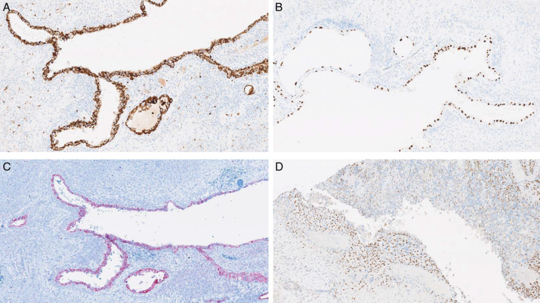 图3. 图示囊壁衬覆上皮弥漫阳性表达Napsin A(A)和HNF1β(B);ER局灶弱阳性(C),p53野生型着色(D)。