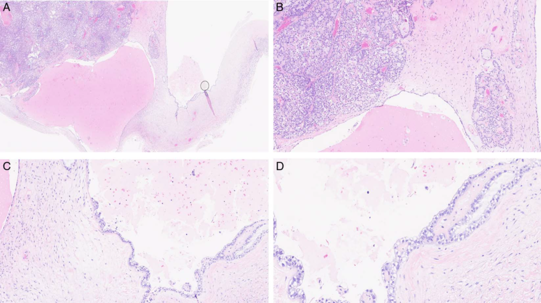 图5. (A、B)卵巢透明细胞癌,周围有衬覆单层细胞的子宫内膜异位囊肿;(C、D)高倍镜下,囊壁衬覆细胞的细胞核有非典型特征,胞质透明。