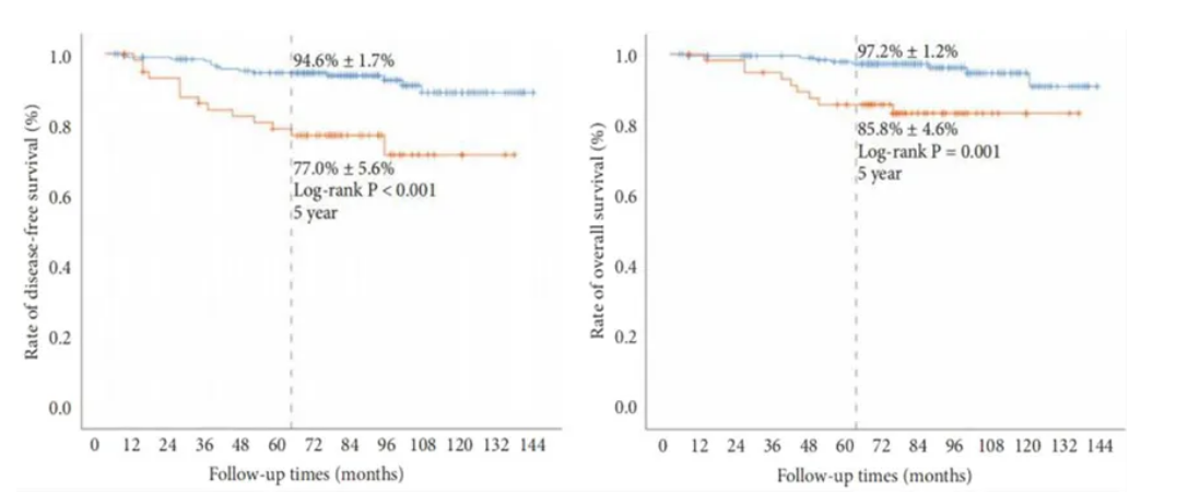 图1.ER+/PR+组(蓝色)和ER+/PR-组(黄色)的生存分析