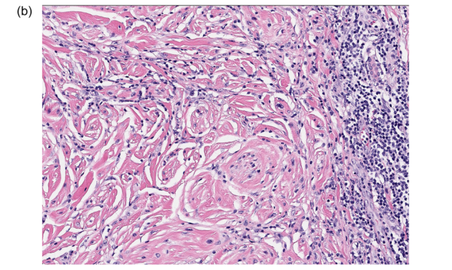 图1.促纤维组织增生型黑色素瘤,单纯型。(A)图示真皮内和皮下有粉染的纤维性区域,伴簇状淋巴细胞;(B)纤维母细胞样梭形黑素细胞,散在于纤维性间质内,周边有簇状淋巴细胞。