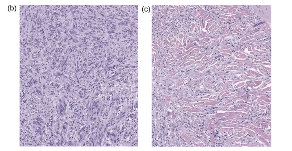 混合型DM中,非纤维组织增生型肿瘤成分可能会表达Melan-A/Mart1、酪氨酸酶、MiTF、HMB-45,主要是呈上皮样细胞形态的时候、罕见的未分化DM可能会不表达所有黑素细胞标记,包括SOX10或S100P,也可仅为极轻微的阳性。
