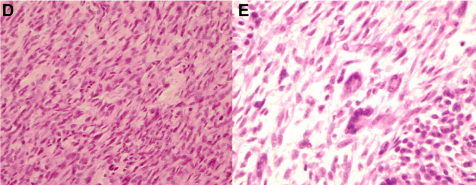 图3.部分病例可见梭形细胞,细胞核形态温和。有一例可见很多多核巨细胞。
