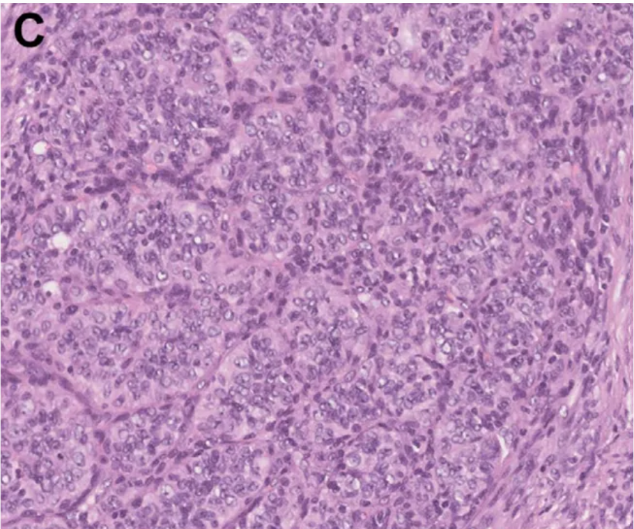 组织学上,该组肿瘤低倍镜下呈多分叶状。部分病例有囊性变和黏液样间质。瘤细胞形态均一,圆形至卵圆形,结构为梁状、小片状、簇状,伴纤细的纤维血管分隔。瘤细胞核形态单一,染色质细腻至斑点状不等,核仁不明显至小;胞质中等量,透明。部分区域梭形特征更为显著,细胞核形态温和。有一例可见大量多核巨细胞。也可见突入血管腔的表现。核分裂计数0-15个/10HPF不等。