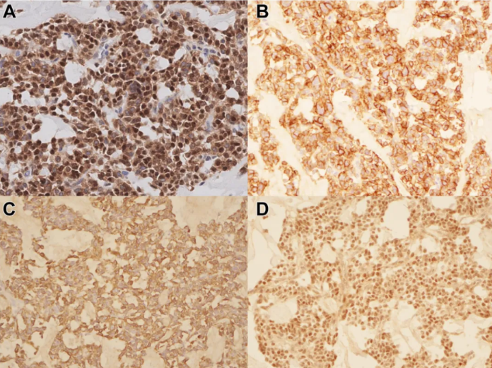 图4.GLI1改变的间叶性肿瘤免疫组化结果:一般GLI1阳性(A),CD56阳性(B);少数病例阳性表达SMA(C);(D)具有大量多核巨细胞的病例阳性表达BCOR。