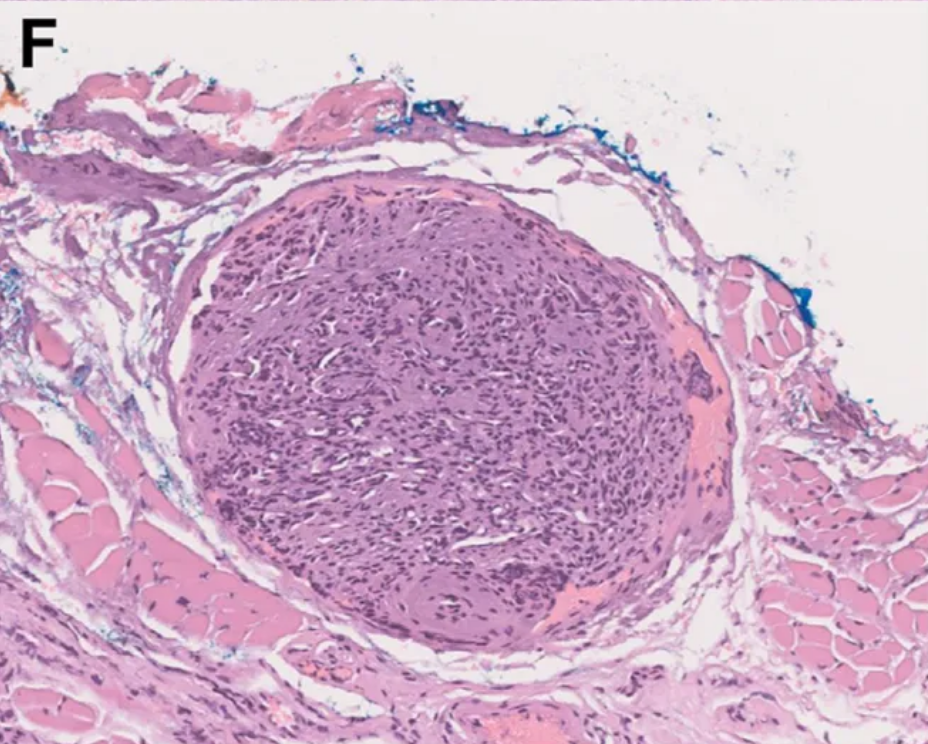 将本文所述病例与文献中报道病例整合,作者对总计167例病例的临床病理特征进行分析,评估了可预测恶性行为的相关信息,结果发现:肿瘤≥6cm、核分裂计数≥5个/10HPF,是预测转移的指标;具有这两项高危特征的肿瘤预后显著更差。该分析还发现,该组肿瘤除了敏感性和特异性极高的表达GLI1外,其他常见阳性的标记物还有CD56、CD10、cyclin D1;部分病例还会表达S100、SMA、AE1/AE3。