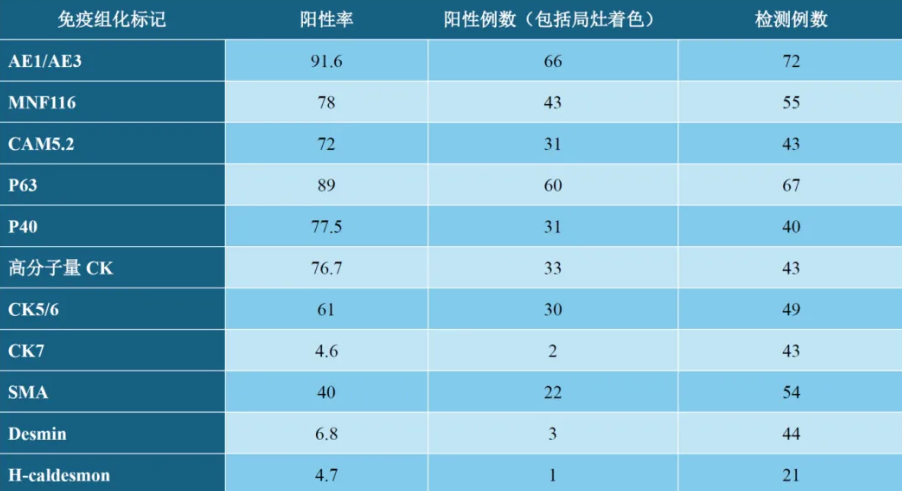 所有病例均有不同项目的免疫组化结果,所有病例均至少阳性表达一种上皮性标记(AE1/AE3、MNF116、CAM5.2、p63、p40、高分子量CK、CK5/6),因此有助于明确为上皮性的恶性病变。该研究中还有部分病例做了间叶性标记,如SMA、desmin、H-caldesmon。不同指标的阳性情况请移步原文或参阅表1。需要注意的是,未见高分化成分的所有病例都做了黑素细胞标记(S100、SOX-10、Melan-A),结果均为阴性。