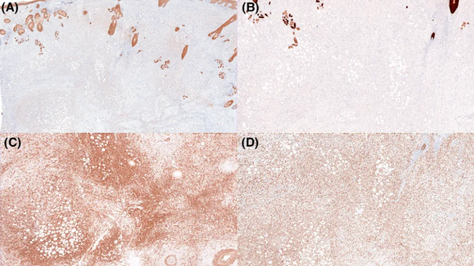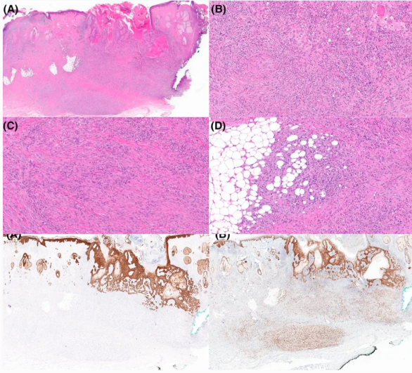 临床信息方面,该组74例皮肤原发肉瘤样鳞状细胞癌中男性52例、女性22例。所有患者均为成年人,年龄41岁至95岁不等,年龄中位数73岁。肿瘤部位方面,涉及头皮(30例)、手臂(13例)、颈部(5例)、腿部(7例)、胸部(4例)、面部(11例)、耳朵(2例)、手部(1例)、阴茎(1例)。从部位来说,该肿瘤主要见于日光照射处皮肤,如头颈部和四肢。