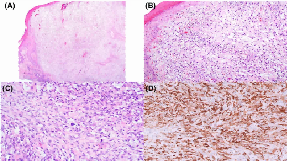 皮肤原发肉瘤样鳞状细胞癌具体表现为非典型梭形细胞和上皮样细胞,排列呈拉长、相互交织的束状。有4例的瘤细胞排列呈席纹状,伴蜂窝样纤维肉瘤样区域。34例可见溃疡。大部分(85%)病例主要为梭形细胞构成,其余病例则为上皮样细胞和梭形细胞混合构成。瘤细胞呈梭形、上皮样,细胞核深染,有多形性,有居中的显著核仁。肿瘤整个范围内核分裂易见,也有非典型核分裂。39例可见神经周围侵犯,2例可见血管侵犯。