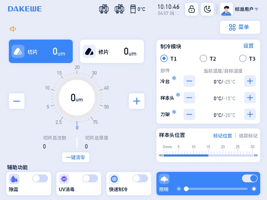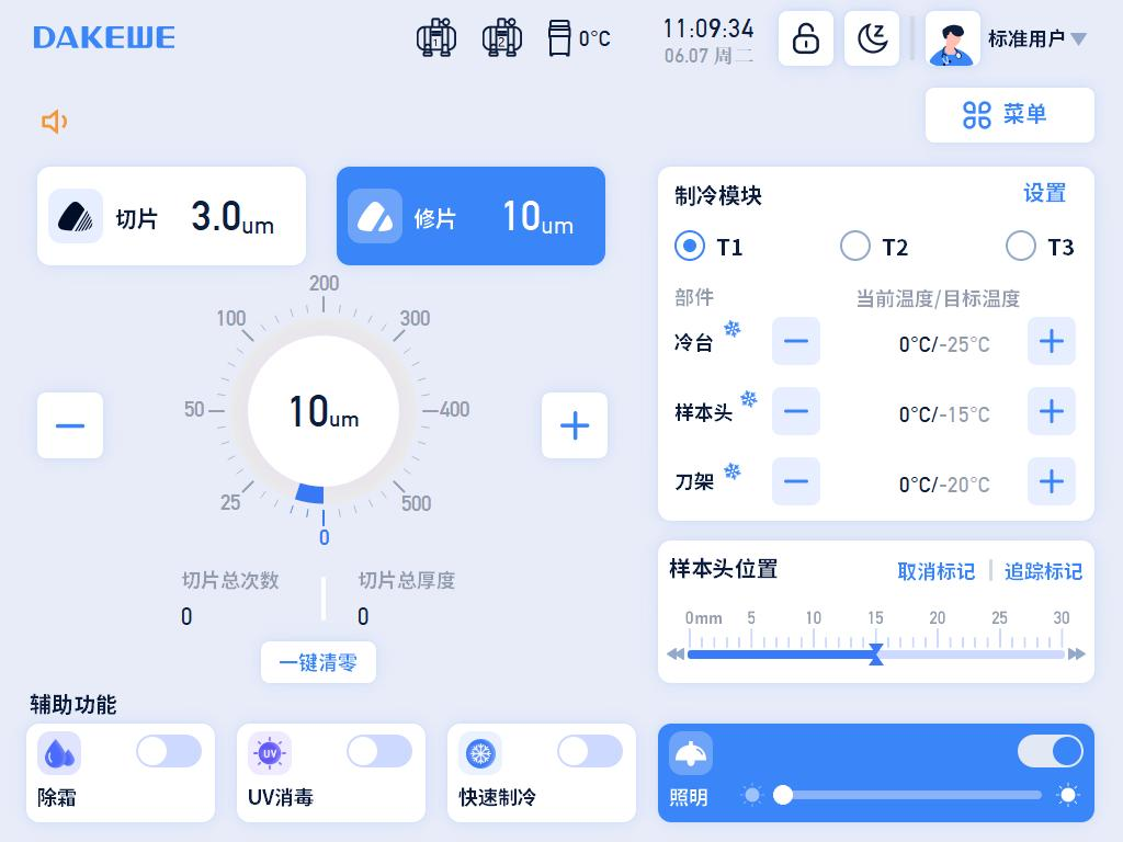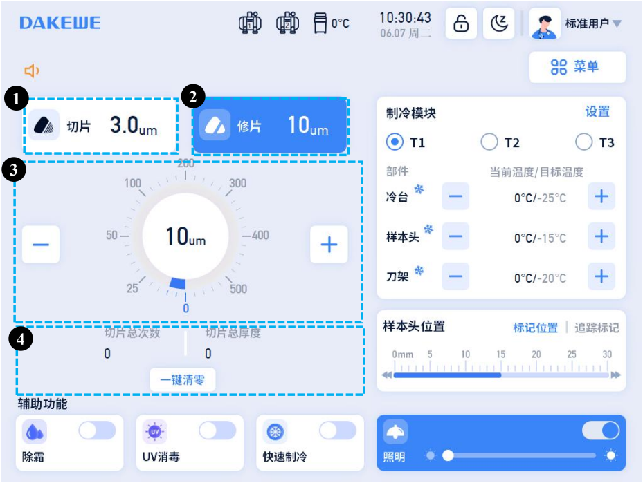 (图3-4)记录切片总次数和切片总厚度,此处切片次数为切片和修片的累计次数,切片总厚度为切片和修片的累计总厚度;一键清零按键可清空切片总次数和切片总厚度。