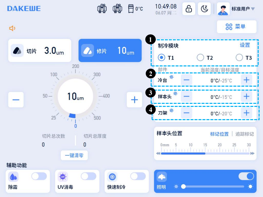 制冷模块可以针对冷台、样本头、刀架进行温度设置。 冷台:按(图4-2)所示,点击按键“-”,冷台设置温度降低;点击按键“+”,冷台设置温度升高,冷台制冷时会显示当前温度和设置温度,同时有制冷图标显示,当实时温度达到设定温度后只显示实时温度。