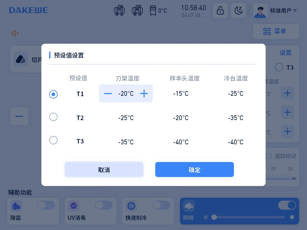 快捷温度设置:按(图4-1)所示,点击设置按键跳转到(图5)快捷温度预设值界面,针对T1/T2/T3三个温度组进行设置,返回主界面就可直接选择(图4-1)中的快捷按键,直接设置冷台、样本头和刀架的温度。
