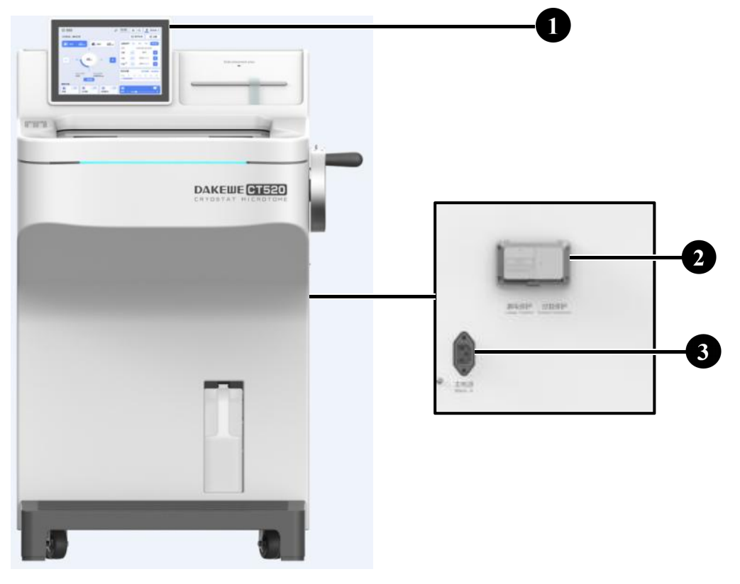 如(图1)中所示,在机器背面的确认电源线(图1-3)连接完毕,打开电源开关(图1-2),开机后显示屏点亮,压缩机同时启动,冷台、样本头、刀架分别按照设定温度进行制冷控温(图1-1)。