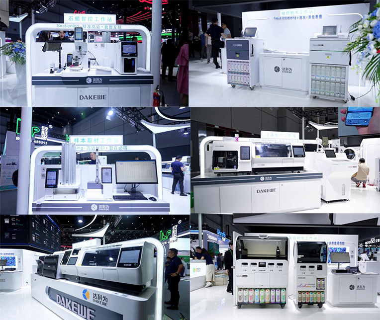 达科为携数智病理整体解决方案亮相大会,包括样本取材工作站、组织脱水工作站、冰冻智控工作站、石蜡智控工作站、染封扫工作站、免疫组化工作站及相关病理试剂。